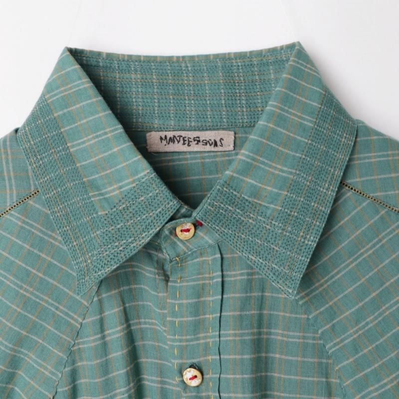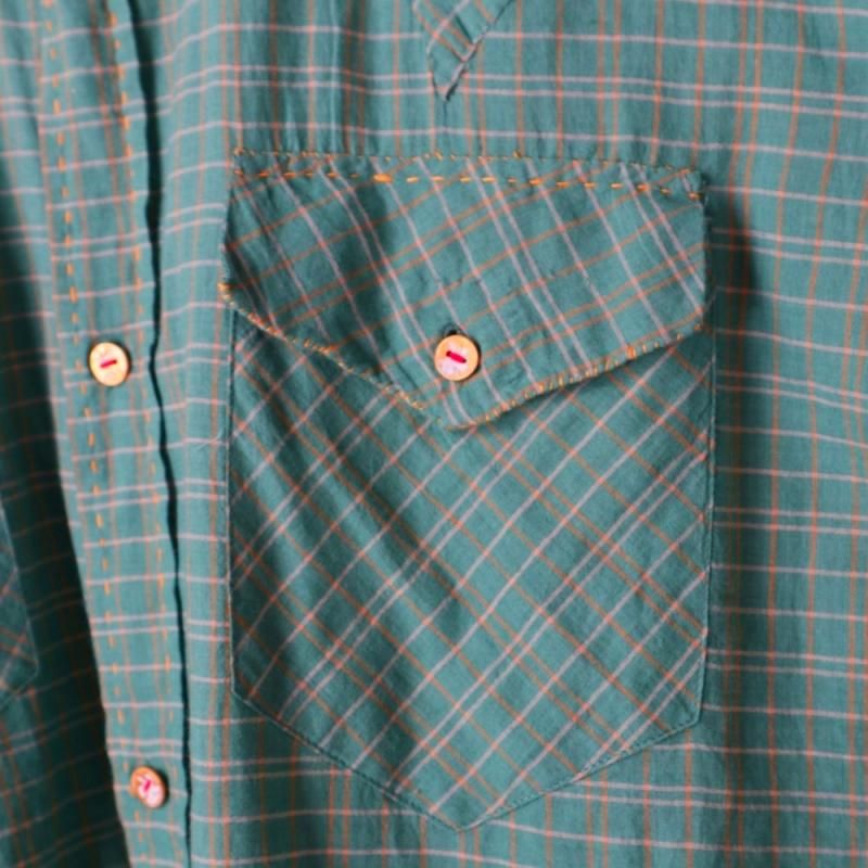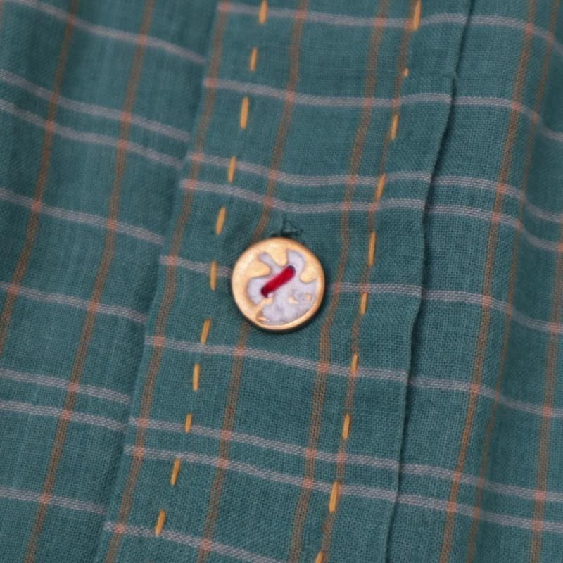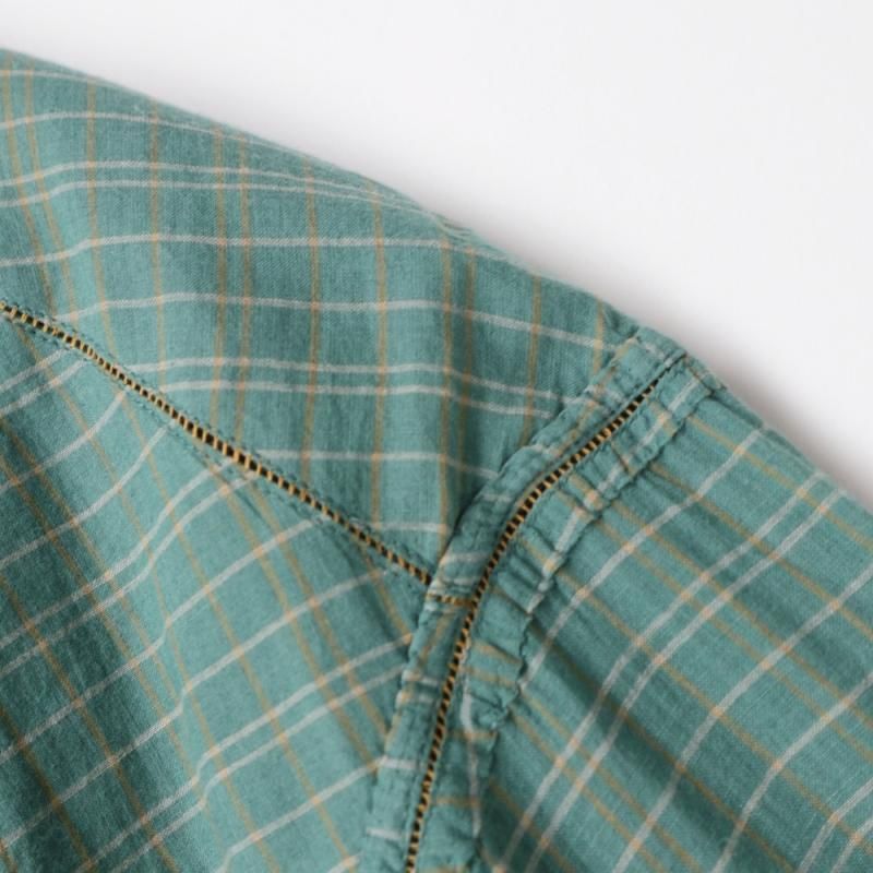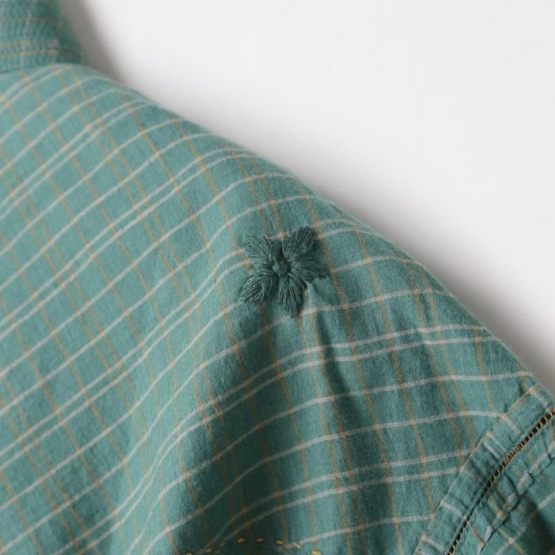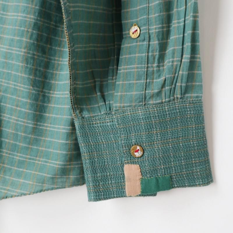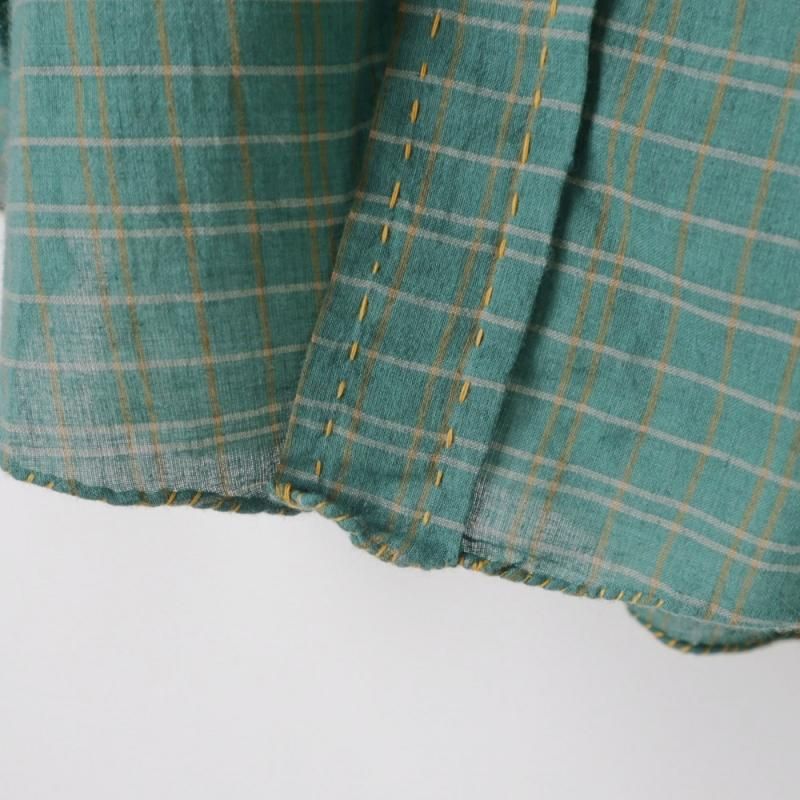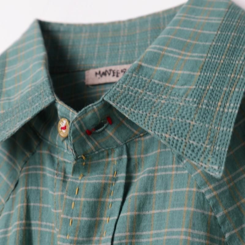 手織りのカディコットンを使用し、ステッチなど手縫いで作られている箇所もあり、味のある表情に仕上げられています。