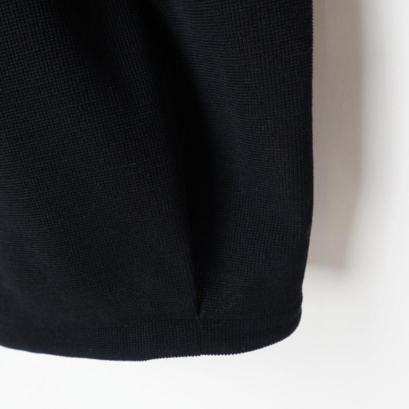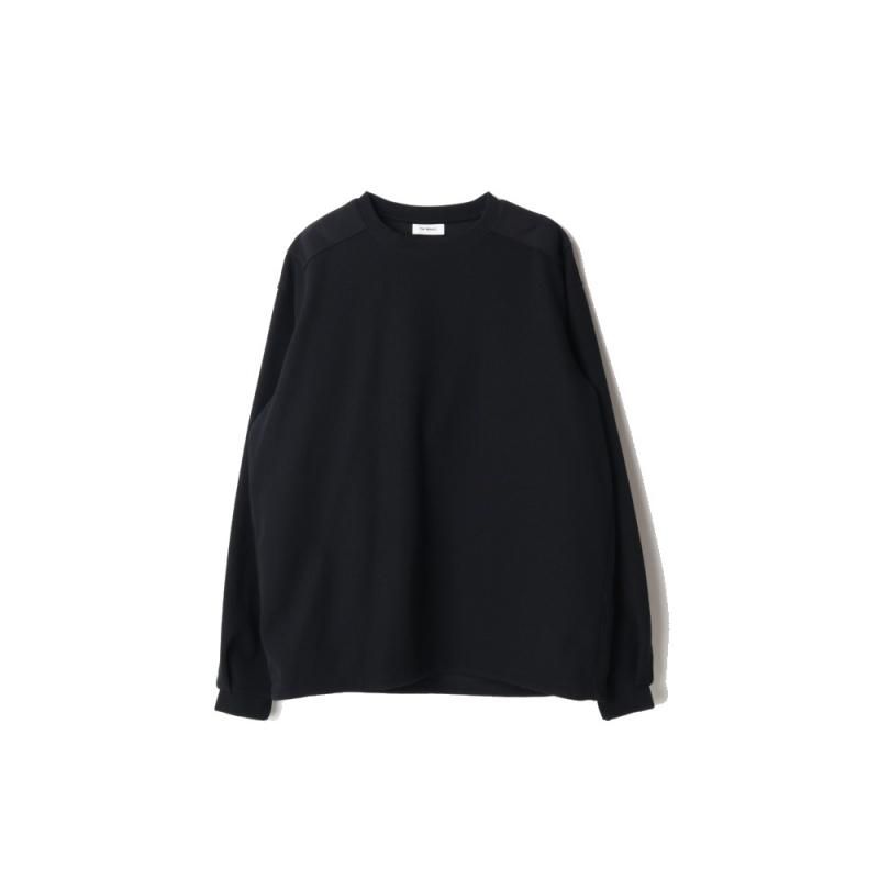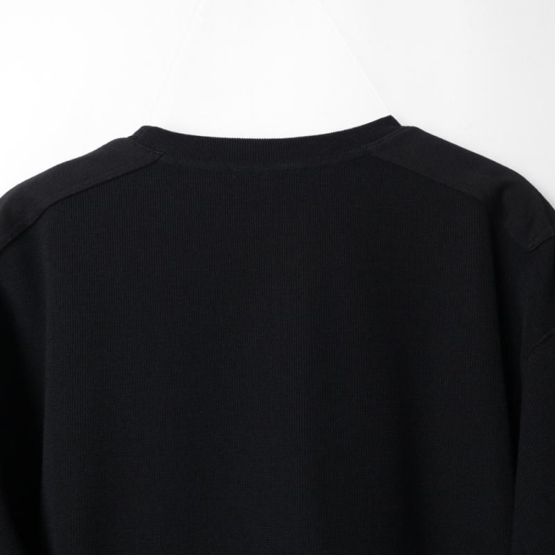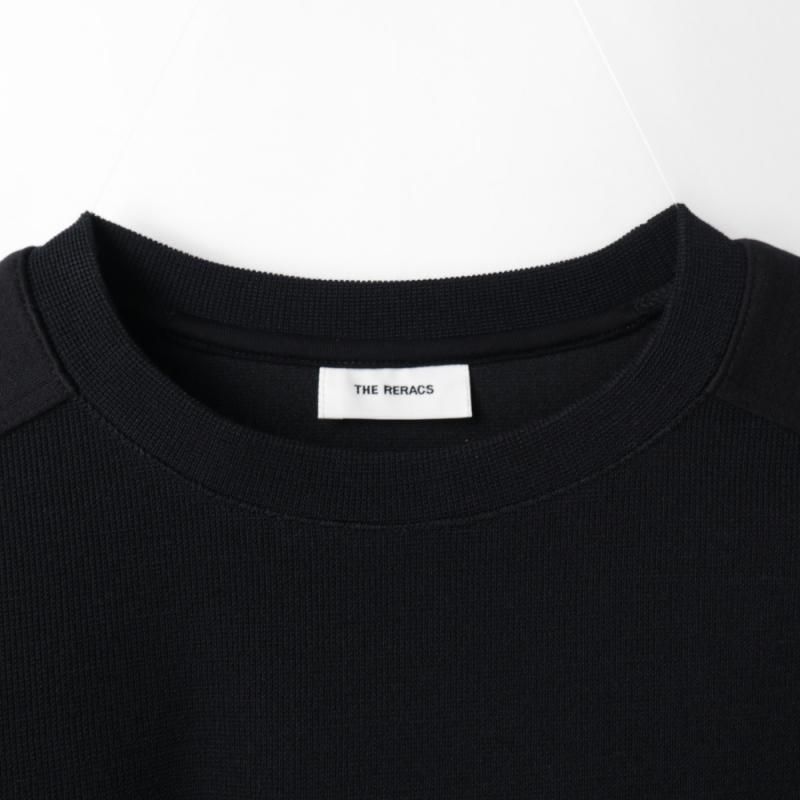 厚みのあるネックバインダーはネック巾を広めに設定し首元に程良い軽さを持たせ、襟ぐりは裏側からも美しく見えるように同色染したフライスで縫い代を処理しています。