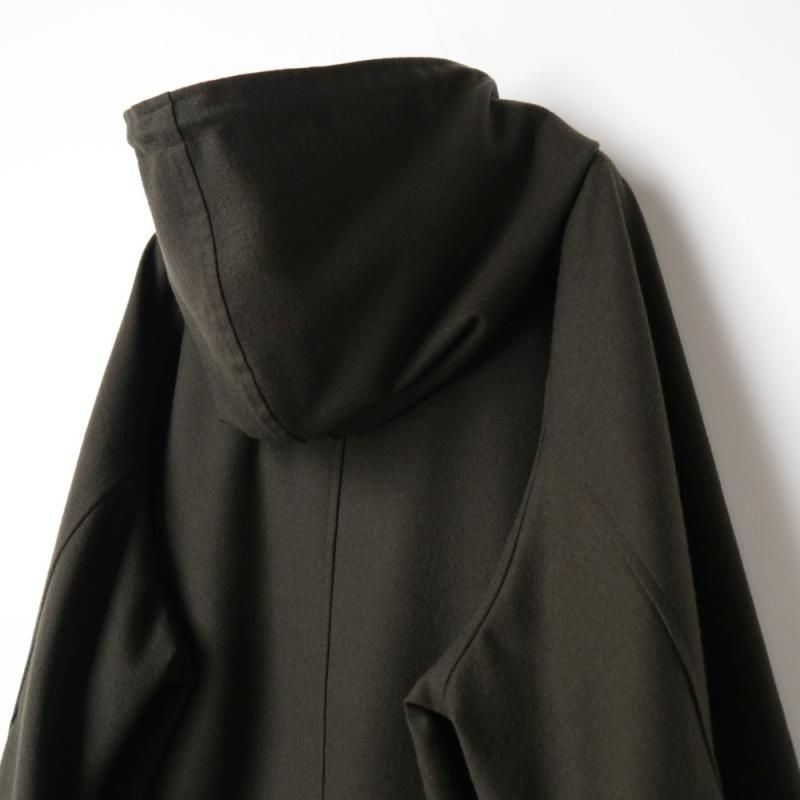 衿元から広がるフードと、ボリュームをたっぷり持たせた袖がデザインのアクセントに。