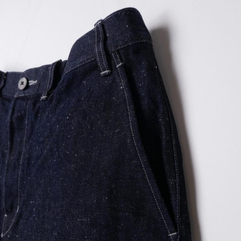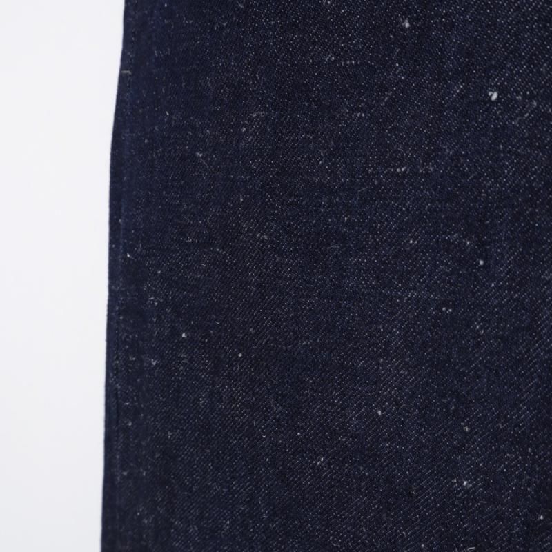 岡山県井原市で織り上げたオリジナルデニム生地は、経糸にロープ染色を施し、表面のみをインディゴ染料で染めて糸芯を白く残したオーガニックコットン、緯糸に太番手の大麻を使用しています。