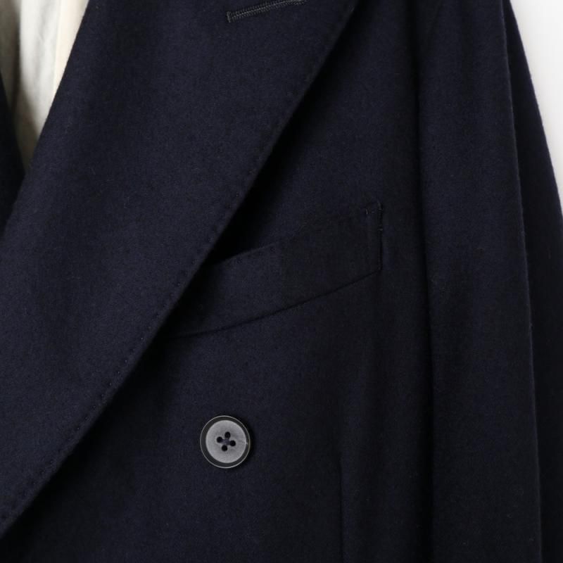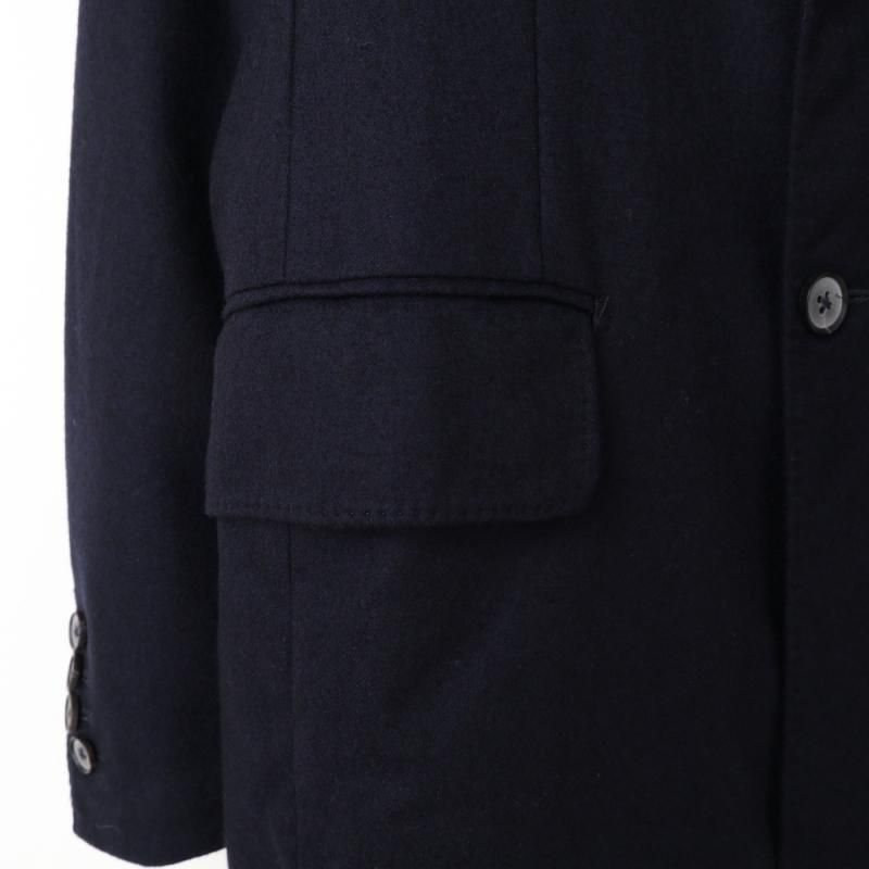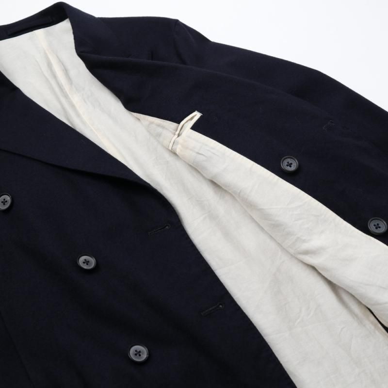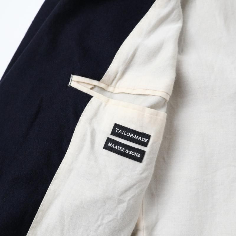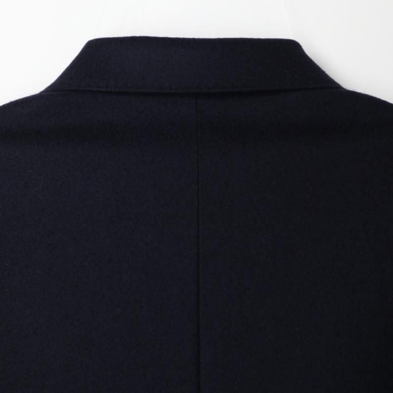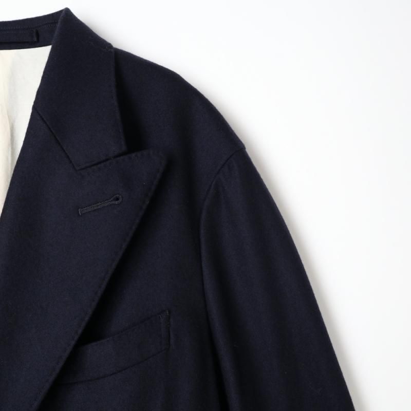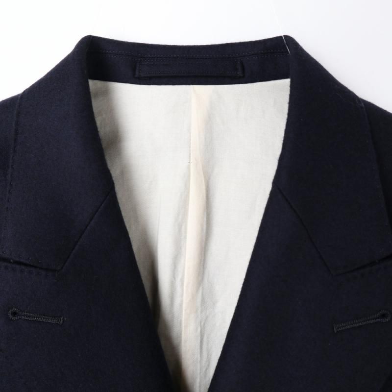 ラペル巾の広いクラシックなディテールに、少し着丈長く設定されたサイズバランスです。