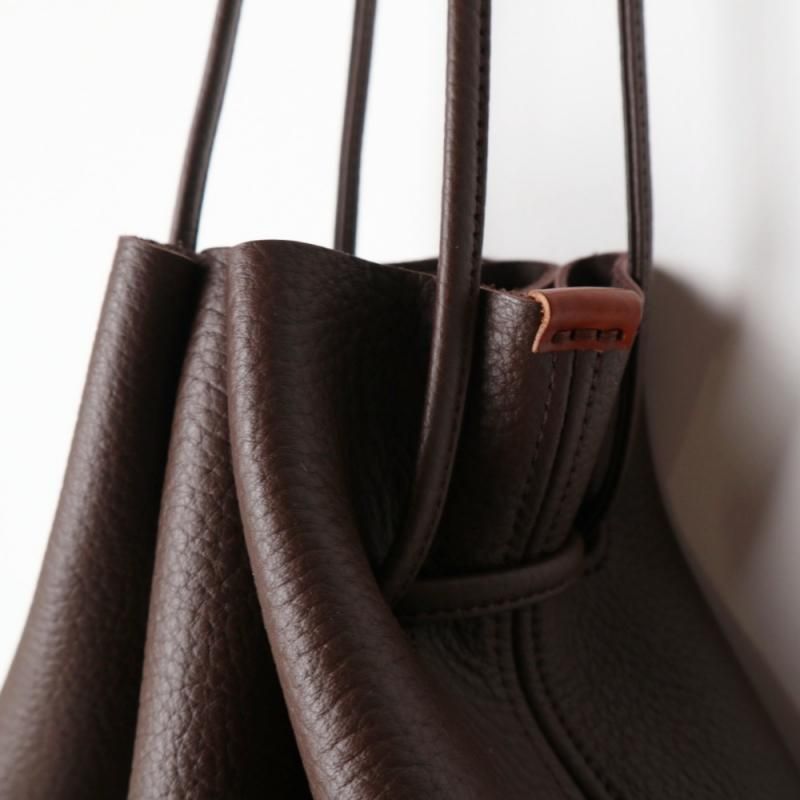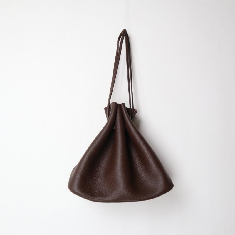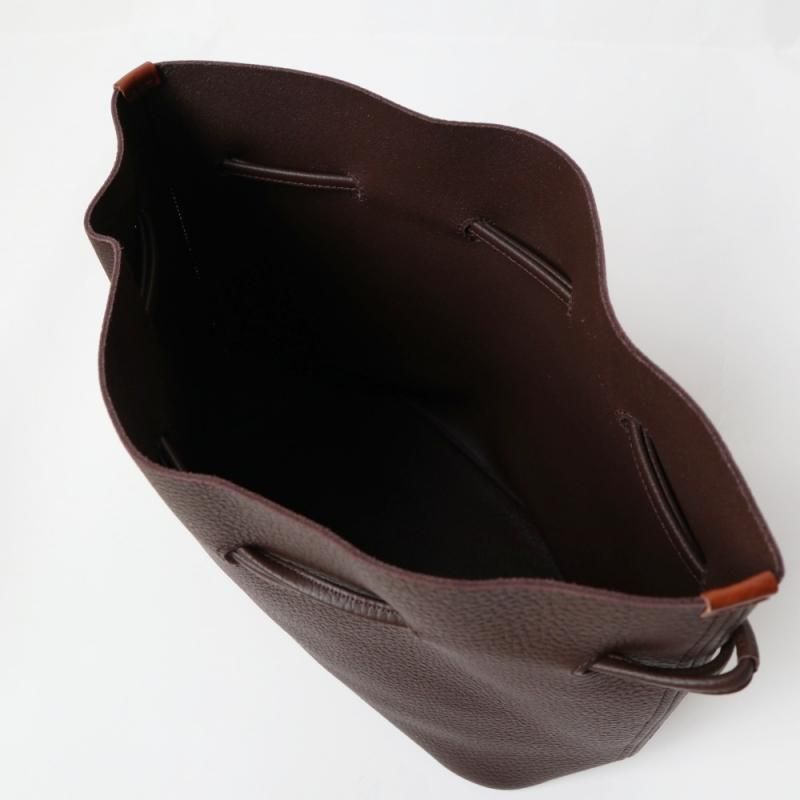開口部の2本の紐は、両サイドから引くと巾着型に、中央から引くとトートのように持つことができ、用途や気分に応じて2通りの持ち方が楽しめます。